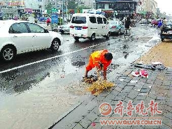 本报8月29日讯 29日的一场急雨,让省城的部分街道有些“吃不消”。为了让雨水顺利流进下水道,避免道路出现大面积积水,保洁员在雨中直接用手清理井箅子上的杂物。