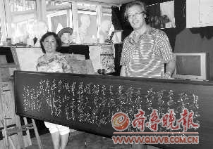 阚志一,55岁,中国民建会会员,中国工艺美术协会会员,青岛市毛泽东书法研究会会长。他浸淫书法50载,尤擅毛体,曾用贴金立体凸字专利技术制作了毛泽东诗词挂屏,获上海大世界吉尼斯总部颁发的《首创贴金凸字作品之最》证书,被国家专利局授予实用新型专利。