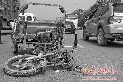 29日上午9时40分左右,在解放南大道的于官屯大桥上,一辆轿车和一辆机动三轮车相撞,三轮车的车头折断,受伤的三轮车司机被送往医院。 本报见习记者 常学艺 白云保 摄