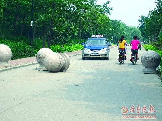 29日,记者在环城公园广福大街路口向东300米左右处看到,原本放在路中间的四个圆形路障被人移开、放倒。据牡丹区园林所工作人员介绍,环城公园沿途放置路障就是为了控制车辆进入,可此时,被“放倒”的路障在来往的车辆面前,形同虚设。