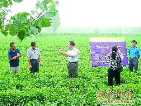 8月28日,东明县东明集镇王官屯村村民围在一块花生地旁,听山东农业大学万勇善教授讲解有关花生种植的技术知识。