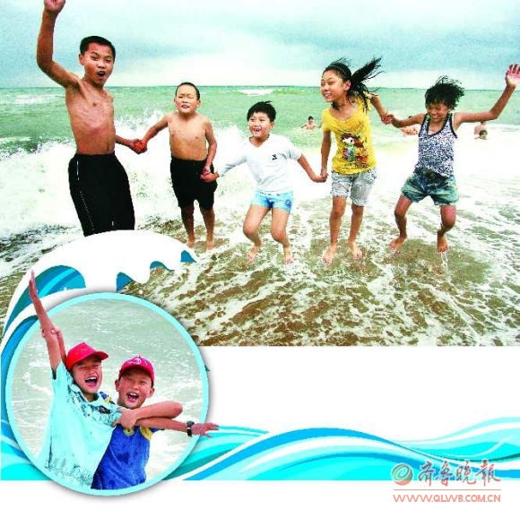 “我们要去洗海澡!”小姑娘秦润淇和郑敏娜没有家长随行,由本报随行记者看着,两个小姑娘玩的很是“疯狂”。两个小姑娘在海边踏着浪花,任凭凉凉的海水打在身上。