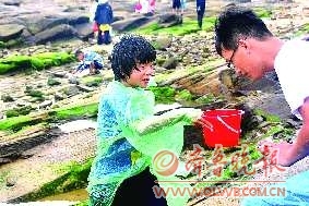 “去赶海了!”27日清晨5点半,窗外的雨哗哗的下着,小记者已经早早从床上爬起来,叫醒睡梦中的父母和随行记者,迫不及待地往海边赶去。