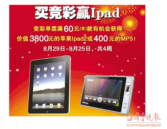 活动期间,凡在泰安市内竞彩店购买竞彩彩票单票金额满60(含)元,均可凭所购彩票参加抽奖,赢取价值3800元的苹果Ipad2。