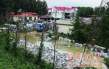 8月29日上午,记者在五莲县叩官镇看到多家石材厂门口都被积水淹没,过往的人都小心翼翼,积水已经没过行人的膝盖。由于积水太深,石材厂的大车都停在门口,没有开工的意思。