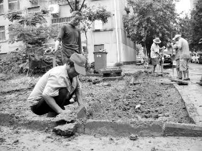 29日上午,在三里庄花园小区,几名工人冒着小雨整修绿化带。