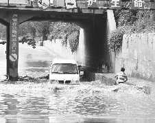 记者来到市区启阳路与陶然路交会处的涵洞,涵洞下的水深大概三四十厘米,正好没过汽车轮胎,骑车的市民只能从涵洞右侧的高一点的窄路通行,过往汽车经过后激起了大大的水花。