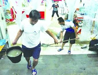 28日19时许,记者赶到了位于芝罘区黄务中学附近的扬帆超市。记者沿着台阶下到位于地下一层的超市门口时,看到超市里有三名员工拿着扫帚和铁铲将水铲到桶里,门口盛水的两个桶已经装满了大半桶,一名员工负责把桶里的水倒进门口的污水井里。
