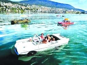 媒体报道,近日来自世界各个地区的50多辆两栖汽车行驶在瑞士的纳沙泰尔湖上,参加第26届两栖汽车聚会。参加的车辆中有“二战”时期使用的两栖登陆吉普车、运输车等等。