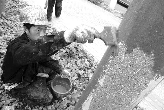 29日,记者在辽河路看到,电业局的工作人员正在对一些已经老化的电线杆涂一层料,以延长电线杆的使用寿命。据悉,此次加固主要是针对东城区域内市政府、运河路等12条10千伏配电线路,运行十五年以上的约366基电线杆进行加固。 本报记者 郑美芹 摄影报道