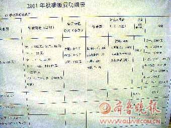 30日上午,记者在这家幼儿园看到,园门外贴了一份“2011年秋季缴费明细表”。根据明细表,小一新生入园需缴纳12184元,包括管理费、代办费、保育费等基本费用,还有伙食费、被褥费、教材费、必学特色费、综合费以及教育委托费等(下图)。