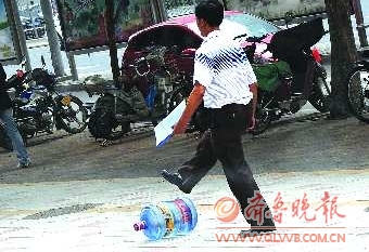 30日,济南泺源大街上,一位正扛着矿泉水前行的小伙子累了,突发奇想,将装满水的矿泉水桶在地上滚了起来 本报记者 左庆 摄