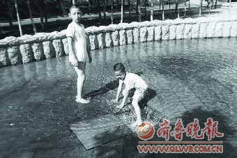 30日,在南京路海泊河公园,几名儿童在水池的泄水口附近游玩,十分危险。记者多次提醒但是游玩的孩子仍不在意。暑假即将结束,游玩的孩子勿忘安全。