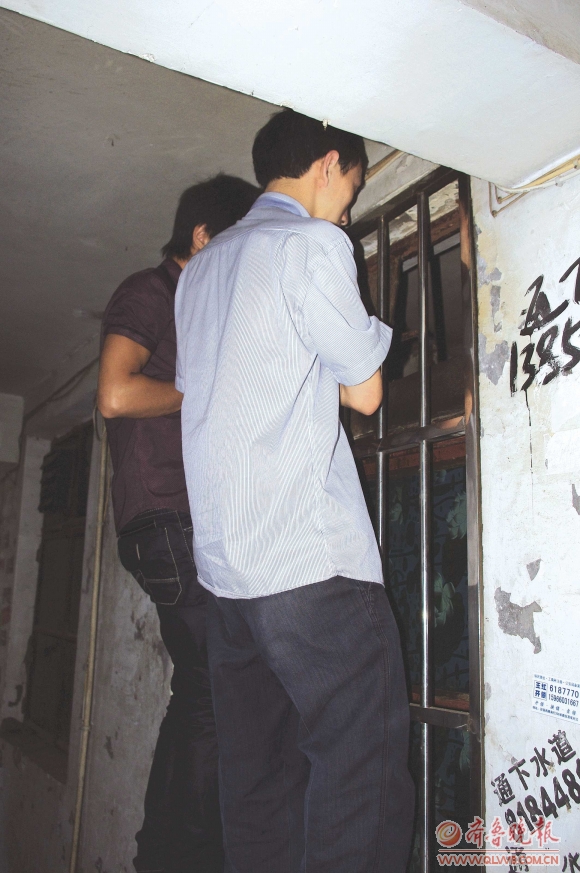 郑春诚的哥哥郑展宝(右)和朱丹丹的表哥周大喜(左)爬上房屋的窗户,他们急切想知道自己的亲人生前所居住的地方是什么样子。本报记者邵艺谋摄