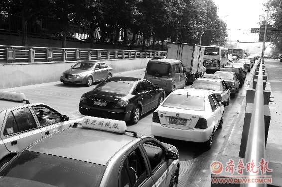 路上一辆出租车出故障停在路中央,道路当即变得堵了起来,往东行驶的车辆纷纷鸣笛,贴着骑电动车的市民艰难行驶。