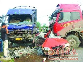 15时34分,庆云县渤海消防中队接到报警后,迅速出动一部抢险救援车、一部水罐车和13名官兵赶赴现场。到达现场后,消防官兵看到,现场一片狼藉,车辆相撞破碎的残片、零件、玻璃碴散落一地,已经严重变形的出租车紧紧夹在两辆大货车中间。