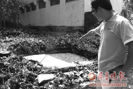 8月30日,当记者再次来到这两处天坑附近时发现,位于菜地附近的那处“天坑”已被填埋,地上铺着沙石和土,在村民王政昌屋后3米远的地方,有一个积满污水的大水坑,村民王政昌告诉记者,这就是塌陷的坑,当天上午村里用挖掘机把坑上面的混凝土石板全都启开后,下面就形成了这么大一个水坑,原本是要用石头和钢筋混凝土进行填埋的,可坑里都是污水,也不知道有多深,所以暂时没办法进行填埋。