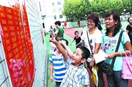 8月30日,临沂四小张榜公布班级,学生和家长在看榜。