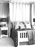布帘围合床头 也许装修时剩下的电镀水管可派上用场了,一根T型管连接一根长管和两根短管,分别固定在墙面和顶面上,在布帘的一端打上大号的金属扣眼(窗帘加工店可做),然后穿到管子上,床头两侧延伸出的帘子可围合住床头,更有安全感。颇具工业感的造型和用材,非常适合单身男子的寝室布置。 (辛浪)