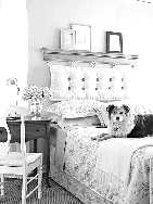 软垫兼做背板 做一个与床同宽的软垫当作床头背板,睡前靠着看一会儿书是一件非常惬意的事。为了让垫子更有型有款,可以买一些比较有特色的纽扣缝在垫子上,矩阵排列。可根据自己的喜好选择或软或硬的填充物。做好后,在软垫的一侧穿上挂绳,挂在墙壁的饰板上即可。这种饰板其实就是门套线或窗套线,可根据自己的喜好挑选复杂或简单的线条。