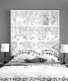星光闪耀床头 这块床头板能让你联想到圣诞节时透过结霜的玻璃窗看星星的情景。它是由结构简单的木质框架组成,首先将它钉在墙面上,并在木框架后面挂上几串小灯,你可以选择节日或开PARTY后剩余下的彩灯。节日串灯的光线透过半透明板过滤,显得格外柔和浪漫。