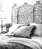 活用铁艺屏风 卧室床头后方用铁艺屏风作为装饰,也许在中国不常见,却是西式乡村很常用的手法,适合强化氛围,优雅的曲线在空间中蜿蜒,可以增加整体空间的动性。所用屏风可以是铁艺乡村风格,也可以根据你的喜好用些家传老旧物件,如中式木漆屏风等。总之,用什么都不重要,只要精心搭配卧室的整体风格,效果就一定出彩。