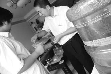 环雅矿泉水的工作人员为项先生讲解桶装水知识。  本报记者 郑美芹 摄