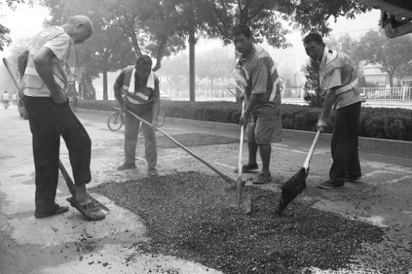 30日,东昌路非机动车道上,市政公用事业管理局的施工人员在修补破损路面。据悉,近期内,该局将对城区每条道路的破损路面进行修补。 本报记者 邹俊美 摄影报道