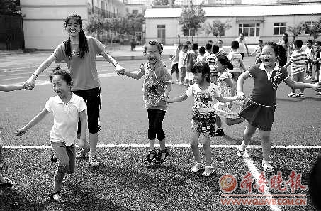 8月31日,在山师附小齐鲁合作学校校园里,报完到的孩子们来到操场上做游戏。 本报记者 王媛 摄