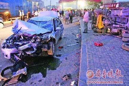 “当时那两辆车车速特别快,刹车声音特别大,要不是有这个6轮货车,这个小车就要撞到里面来,撞的人还多。”目击者惊魂未定地告诉记者。记者到达现场后看到,最南面一辆白色小轿车撞得已经面目全非,前后都严重变形,紧挨白色小轿车有一辆白色的6轮货车被顶翻,车上的玉米撒落了一地。再往北,是一辆红色面包车和一辆三轮摩托的骨架,只剩下了车把部分的半截,车轱辘散落在一旁。继续往北,是一辆黑色的尼桑小轿车,前顶机盖严重变形,和一辆出租车及两辆摩托车挤撞在一起。最北面是另外一辆黑色轿车,受损比较轻。