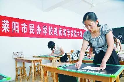 近日,莱阳市举办民办教师技能大比武活动,来自该市6所民办学校的27名老师参加了大比武活动。据了解,这是该市首次举办此类活动,图为民办老师们正在现场写板书。通讯员 崔潇文 李震 本报记者 赵金阳 摄