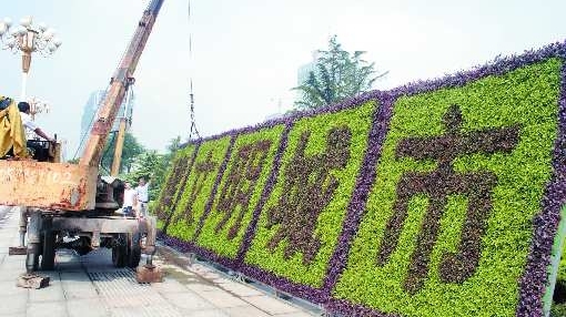 8月31日,12块用五色草制作的大型标语立体造型在三和街文化广场吊装完成。