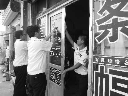 为了迎接国家卫生城市的复审,8月31日起,滨城区执法局联合北镇街道办事处共20名执法人员开始对黄河二路、黄河三路、黄河五路的渤海五路到东海一路路段进行为期三天的集中整治活动,主要整治沿街店面占道经营、乱摆乱放、店外制作经营、墙体广告等问题。图为滨城区执法局工作人员在清理黄河二路沿街店铺的门贴。