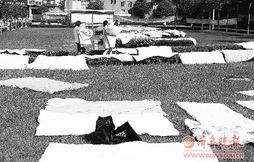 31日下午,不少学生在大学城文泽园生活区洗衣晒被,宿舍阳台窗口、楼下晒衣架、篮球架的栏杆、宿舍楼前的草地,凡是有阳光的地方都挂满了花花绿绿的被褥。