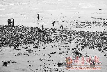 8月31日,在第三海水浴场,许多市民趁着落潮之际,来到海边赶海,挖海蛎子捡海货收获颇丰。