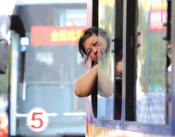 8月30日,车流拥挤的龙潭路,众多车堵在一起。一位妇女竟将头从车窗内伸出来看光景。