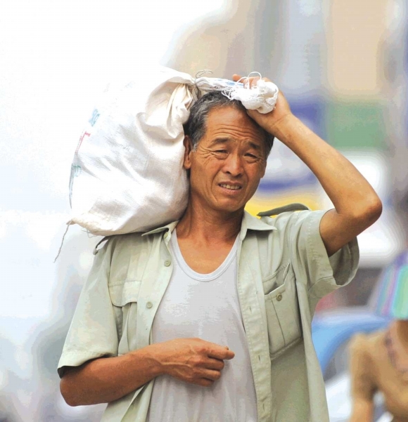 1日,泰城气温最高达30℃,正午太阳毒辣。图为一位市民用手扛的麻袋遮挡炎日。