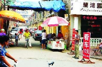 9月1日中午,在市区启阳路中段市妇幼保健院附近,一名手持“东10米停车”牌子的老人坐在路边。他告诉记者,停车的地方是市妇幼保健院东侧居民区里的一条巷子。顺着他的指点,记者看见不远巷口处立着一块写有“看车10元”的大牌子,一名中年男子正拿着小红旗,指挥车辆进出入。