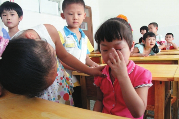 1日,是中小学开学的第一天。在东明小学一年级教室内,一名学生因对新环境不适应哭了起来,这时身边的同学赶紧过来安慰她,让她感受到新朋友、新同学的关心与照顾。 本报记者 吴凡 摄影报道