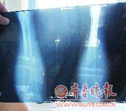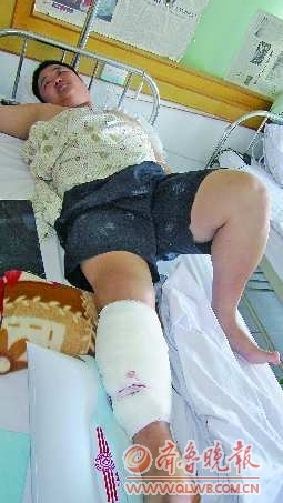 9月3日上午,记者在日照市人民医院骨科见到了受伤的秦凯。秦凯正躺在病床上打点滴,右小腿缠着厚厚的纱布,纱布上还有斑驳的血渍。秦凯的母亲告诉记者,溢出的这些血都是淤血,“医生说只有让淤血都流出来才利于康复。”