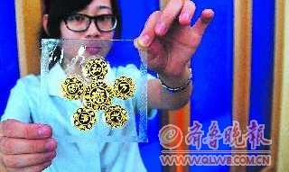 3日,记者在建设银行济宁分行看到,一组黄金制作的“月饼”吸引了不少市民的眼球。这组“月饼”由纯黄金打造而成,售价4万元左右。