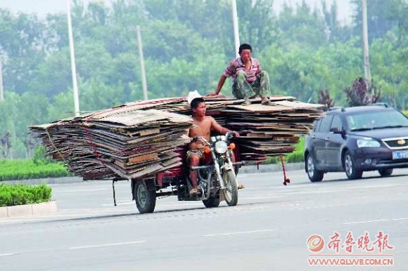 8月31日,德州长河大道与天衢路路口一辆超载的三轮车,上演着马路“杂技”。 本报记者 马志勇 摄
