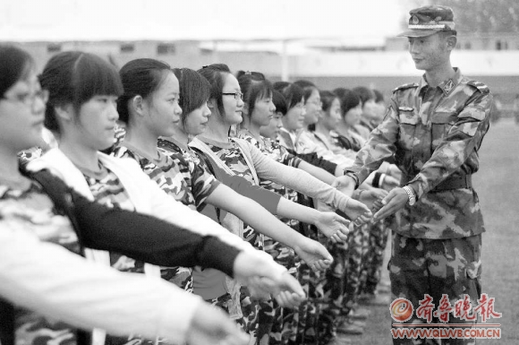 9月4日,菏泽医学专科学校的操场上,新生们迎来了他们大学第一课———军训。天气虽然有点冷,但新生们依然坚持训练,每一个动作都非常认真。一个个新生身穿迷彩服点缀着整个操场,成为学校独具的一道风景线。 本报记者 邓兴宇 摄影报道