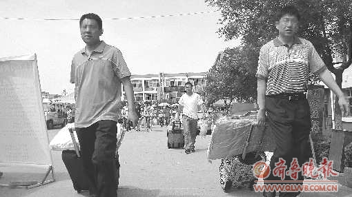 9月3日,在大学城宿舍区,三名新生家长拉着沉重的行李箱,而他们的儿女则轻松地走在前面,如果不看旁边的儿女,或许给人的感觉是:这是三个大龄学生。
