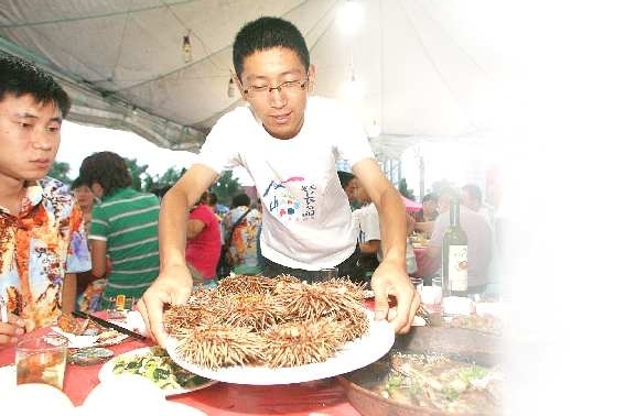 3日晚6:30,在第二届长岛海鲜节千人海鲜宴上,一名服务人员为远方的客人端上大盘的海胆。从这天开始,9月份的每个周六、周日,都会有各类精彩的互动节目在长岛上演,游客除了可以参加长岛的各种民俗活动外,还能享受到最为丰盛的海鲜盛宴。长岛,正在迈向通往国际旅游岛的路上。