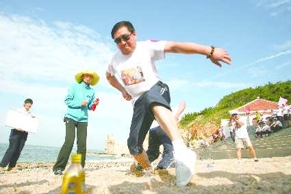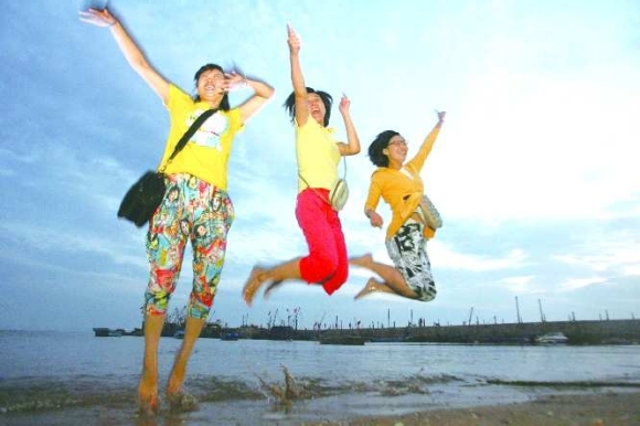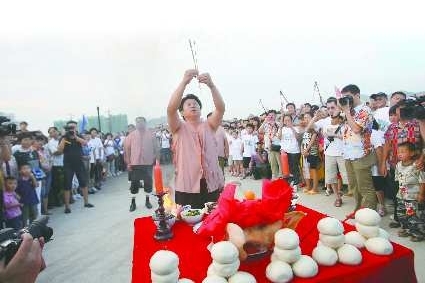 3日下午,长岛望夫礁景区,远道而来的游客正在参加海岛趣味运动会,抢占孤岛、螃蟹运西瓜等趣味赛事让游客们忍俊不禁。下午5点开始的长岛传统祭海祈福仪式、渔家号子表演更是让游客有幸看到了长岛渔民传统的民俗活动表演。傍晚的夕阳从云层中穿过,阳光洒向海面,这种美景令游客们站在海边,久久不愿离开。