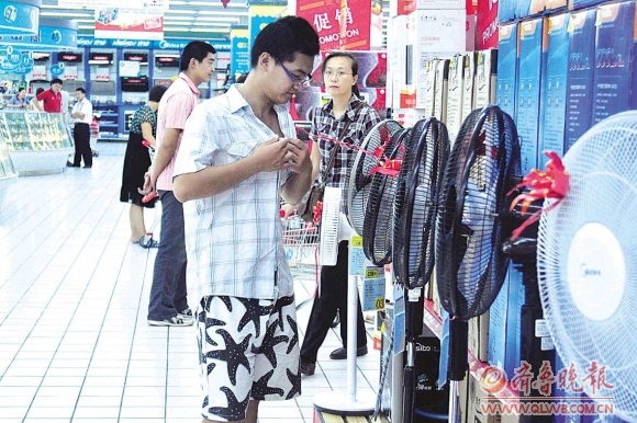 3日中午天气炎热,泰城气温高达29℃。图为一位顾客在超市里感受风扇的凉风。