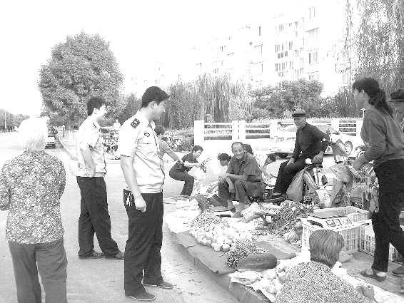 9月4日上午,在东营区新区滨西北路菊香园北门,十多个蔬菜、水果商贩摆满了小区门口两侧。近期正值苹果成熟的季节,新区附近不少果农到小区卖水果,产生的垃圾随意丢弃,环卫工多次投诉。东营区城市管理局直属三中队的执法人员对商贩进行了解释劝导。 本报记者 李金金 本报通讯员 刘宁 摄影报道