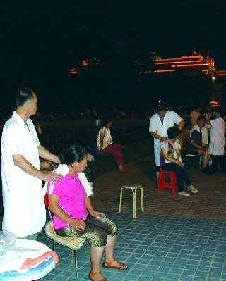 记者粗略数了一下,广场上有十多个这样的按摩推拿摊。夏季纳凉市民较多,每个按摩推拿摊位前几乎都有顾客,有的还需排队等候。