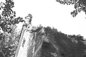 在当地村民、孙氏后代孙思海的带领下,记者来到了北边。“前不久的一个雨夜,这座房子的屋顶塌了,300多年的老房子就这样毁了。”通过外侧的楼梯,孙思海带记者来到了房顶,这座建筑是上下两层,高约6米,房顶已经坍塌,地面上散落着木质横梁和其他框架材料,以及大量破碎的瓦片。